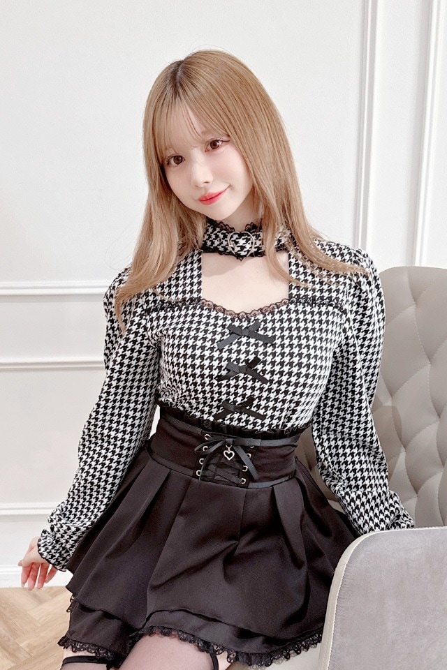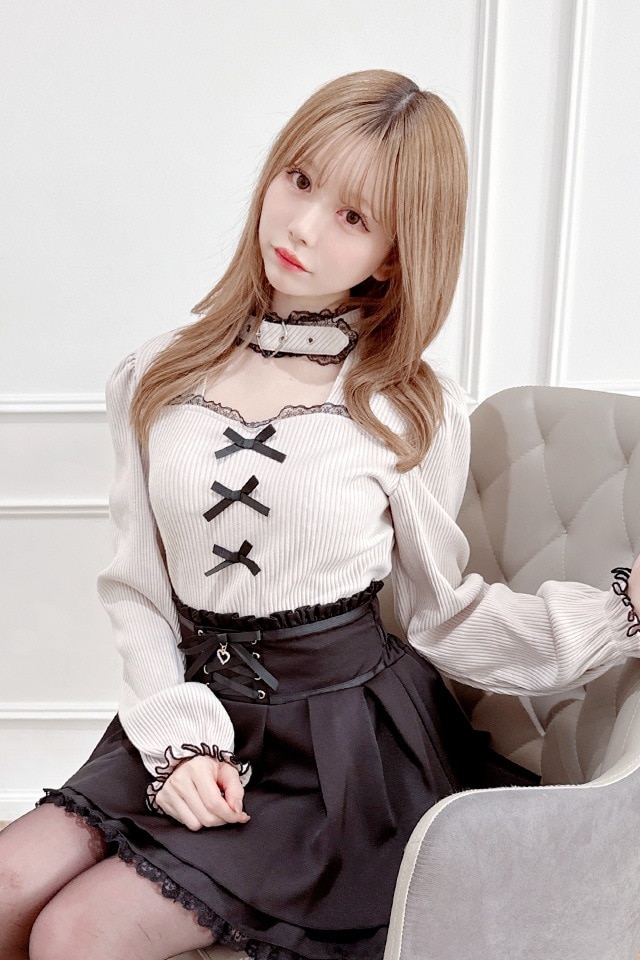 胸元に付くさり気ないリボンやハートバックルの付いたチョーカーが可愛いガーリーさんオススメトップス。