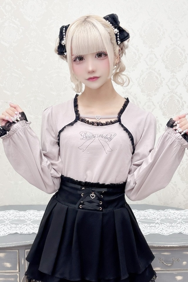 【Princess Melody】ハートバックルテープりぼんプリントトップス - ブラック size-F