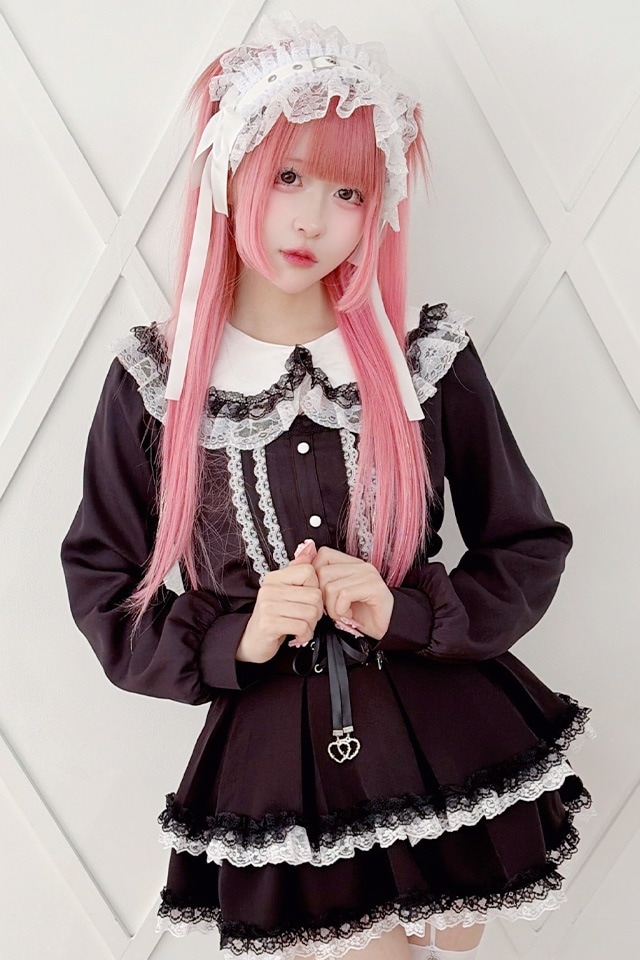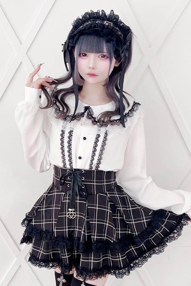 襟もとにはブラック×ホワイトの配色ダブルレースを重ね、一見上品な丸襟ながら、襟をめくるとスクエア型にデコルテが開くデザインになっておりさりげない肌見せが叶います。